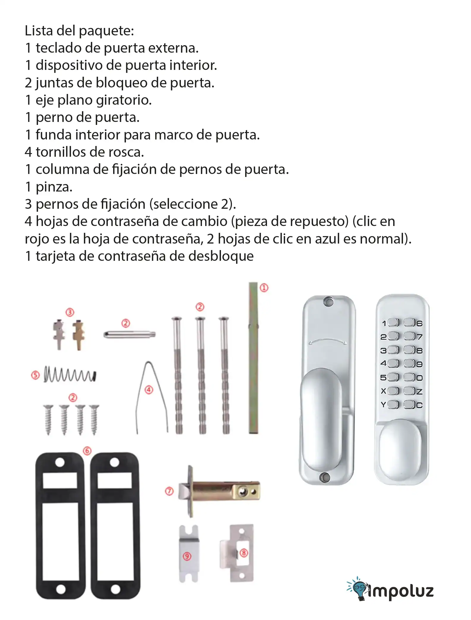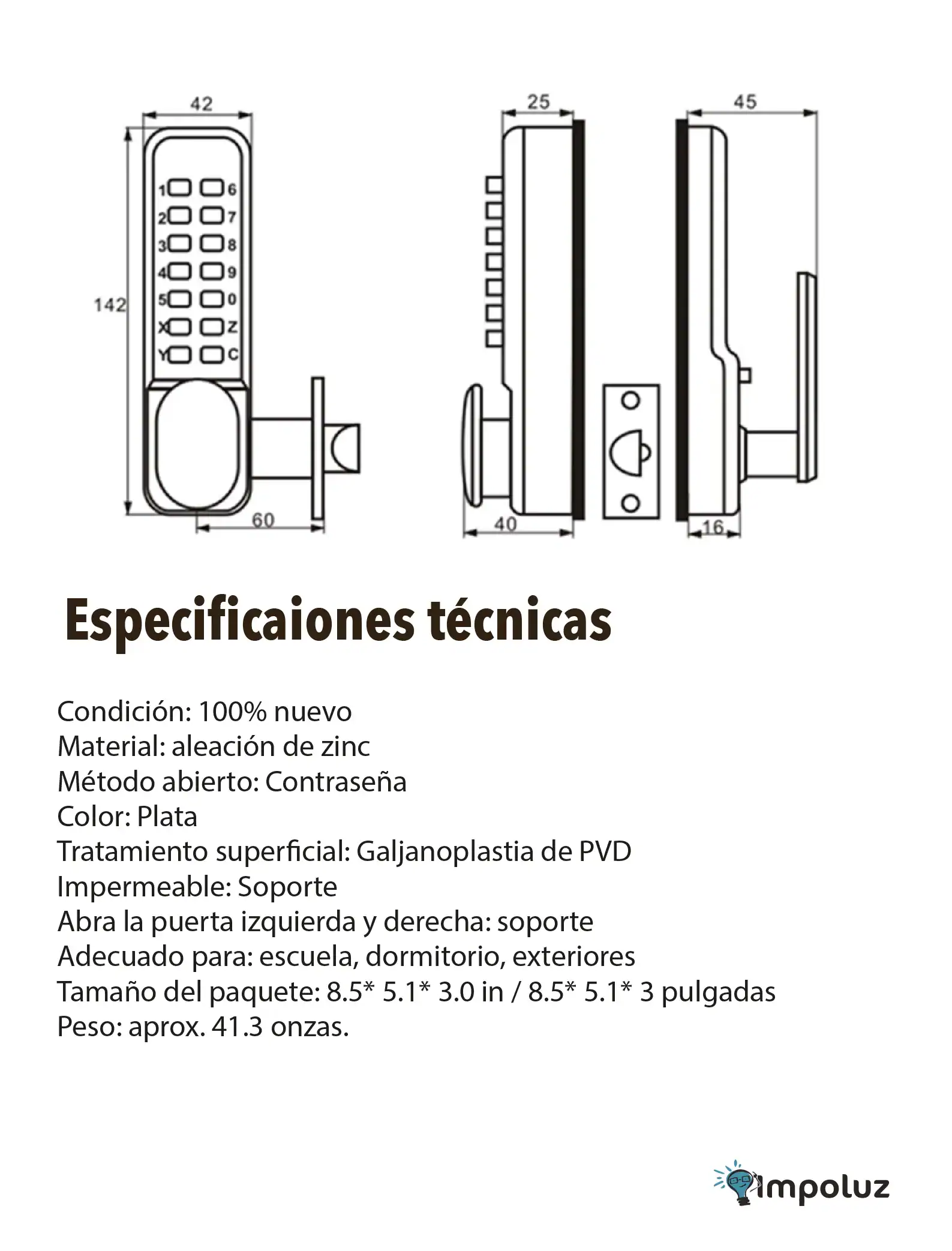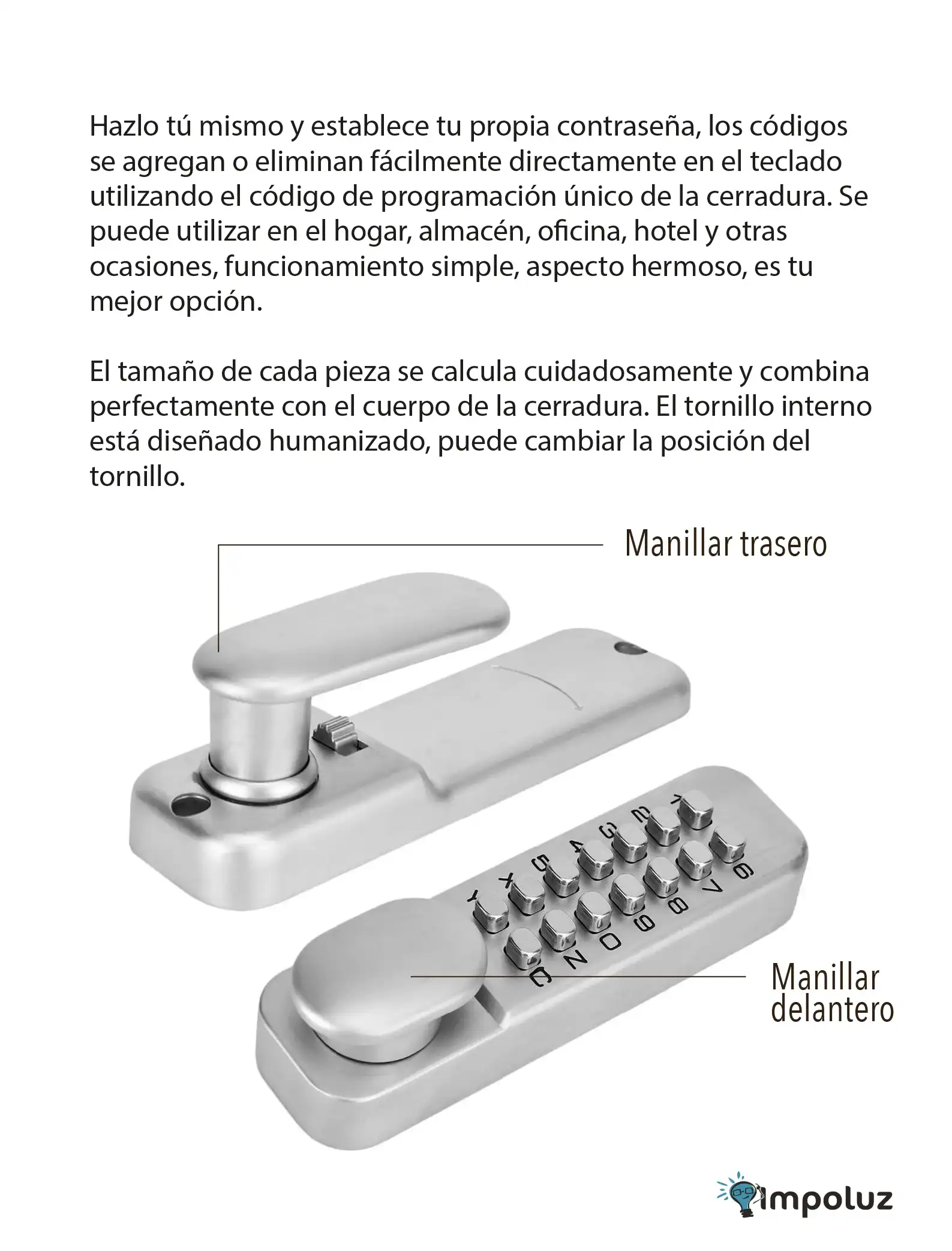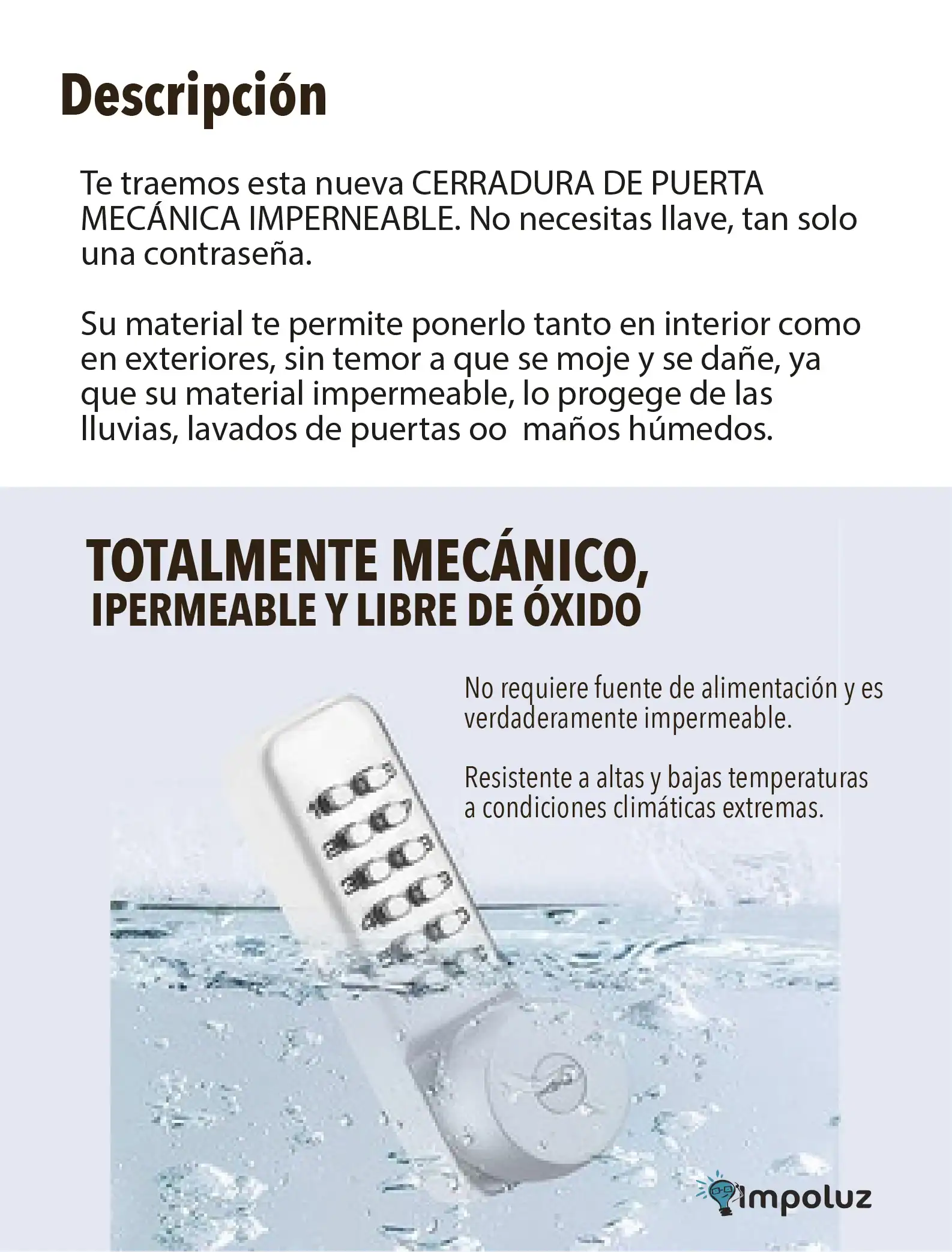 cerradura con clave mecánica, sin baterías ni electricidad. Resistente, segura y fácil de instalar. Ideal para hogar, oficina o espacios comerciales.