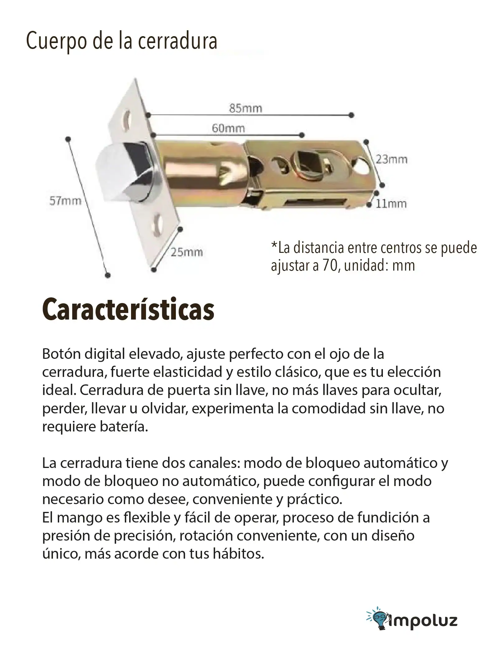 Refuerza la seguridad de tus puertas con esta cerradura con clave mecánica, diseñada para ofrecer acceso seguro y confiable sin necesidad de electricidad, pilas ni conexiones externas. Fabricada en aleación metálica de alta resistencia, soporta el uso constante y condiciones exigentes, ideal para hogares, oficinas, bodegas, armarios o espacios comerciales.