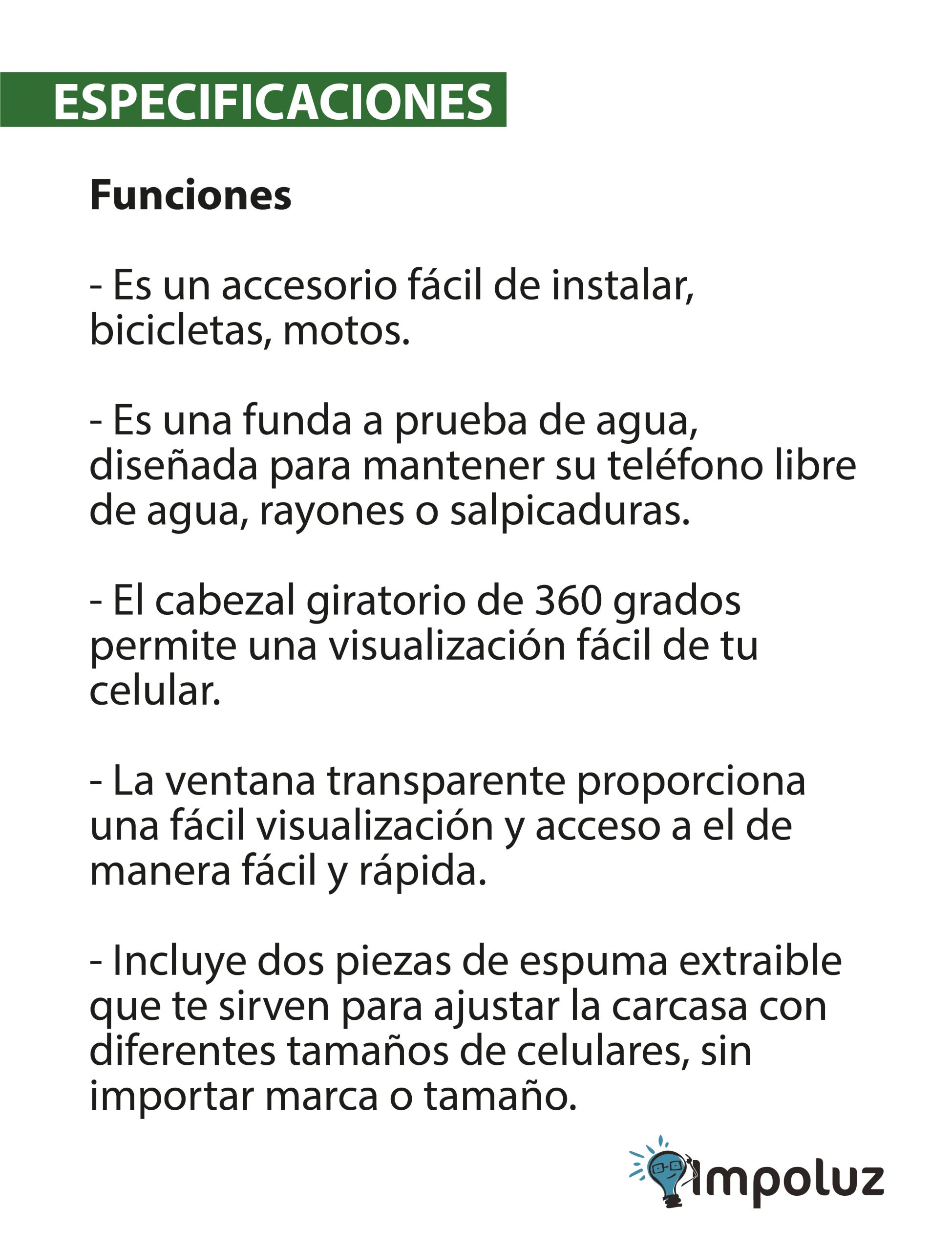 - Material impermeable: Fabricado con material 100% impermeable, garantiza que tu dispositivo se mantenga seco y protegido, incluso bajo la lluvia o en ambientes húmedos.