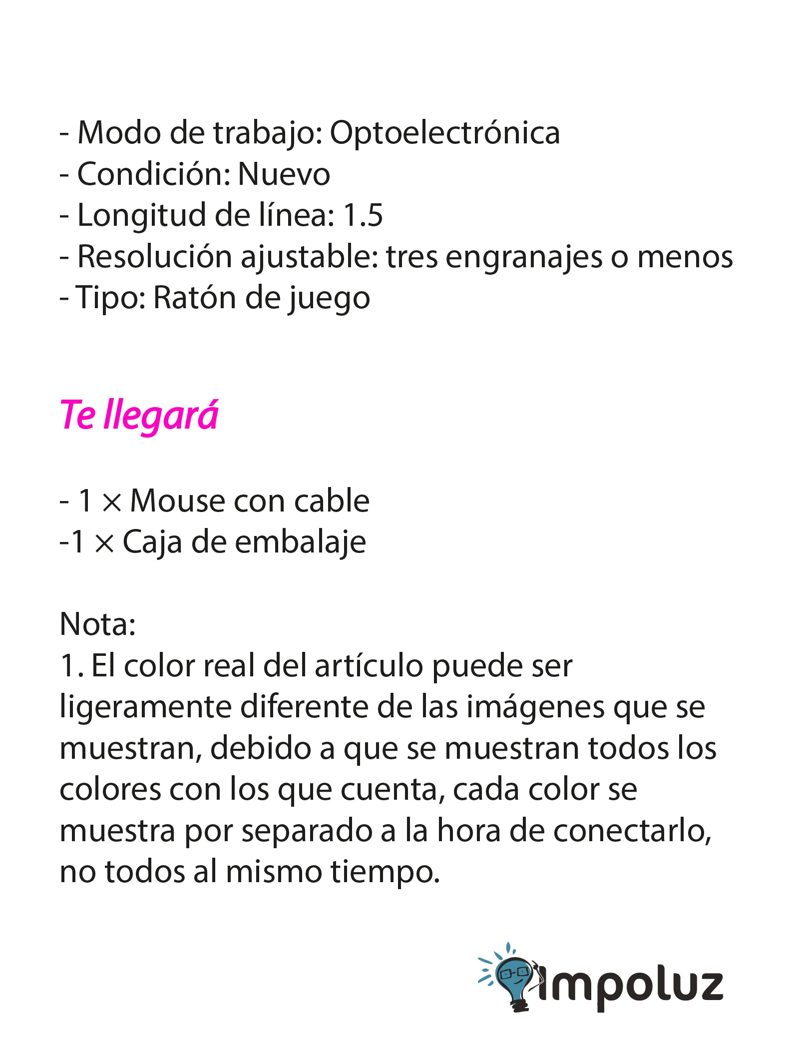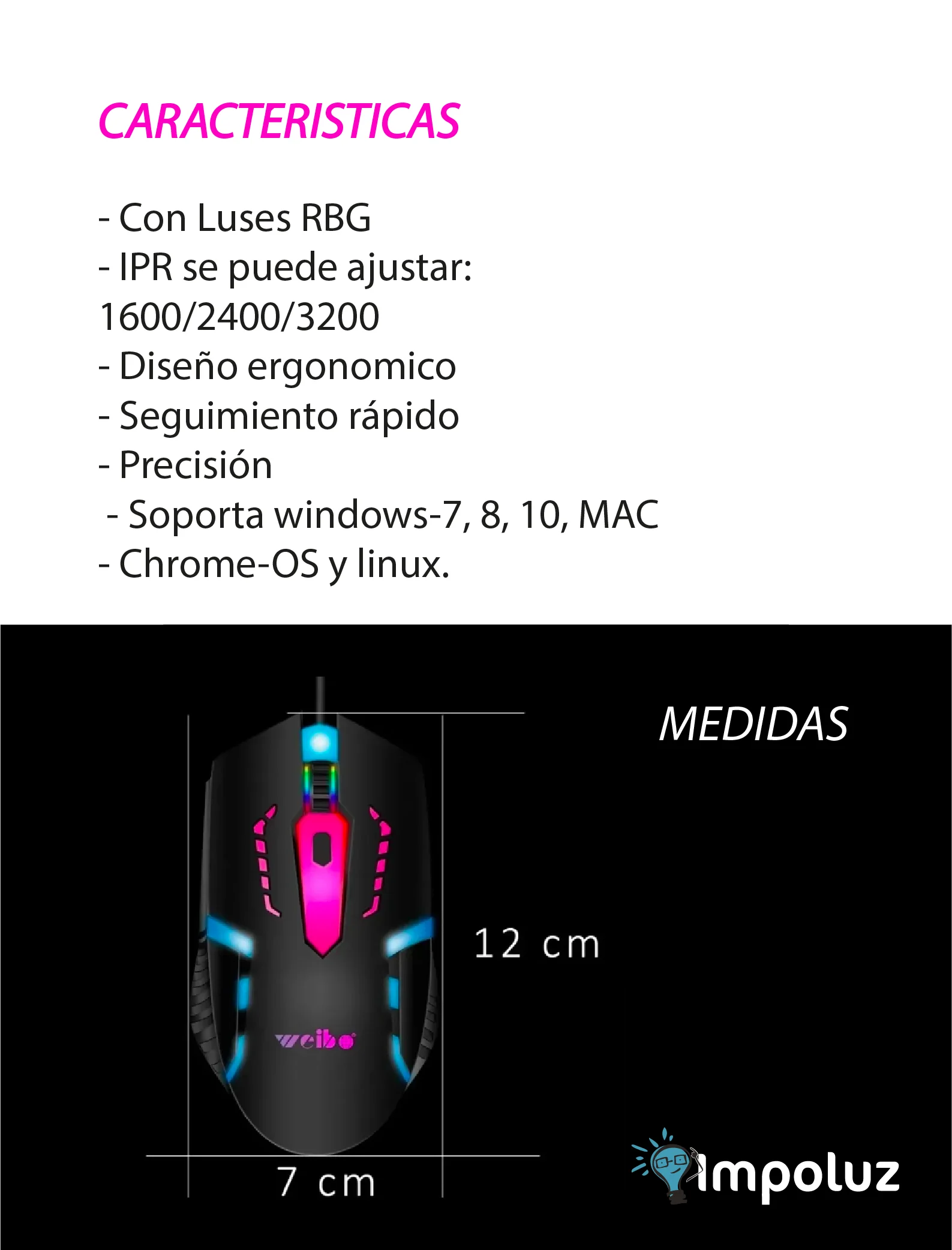 Ya sea que seas un jugador casual o un entusiasta del gaming, nuestro mouse para PC está diseñado para satisfacer todas tus necesidades. Su diseño ergonómico, combinado con su capacidad para ajustar el DPI, garantiza una experiencia de juego cómoda y precisa en todo momento. ¡Hazte con el tuyo hoy y lleva tu experiencia de juego al siguiente nivel con nuestro mouse alámbrico RGB!