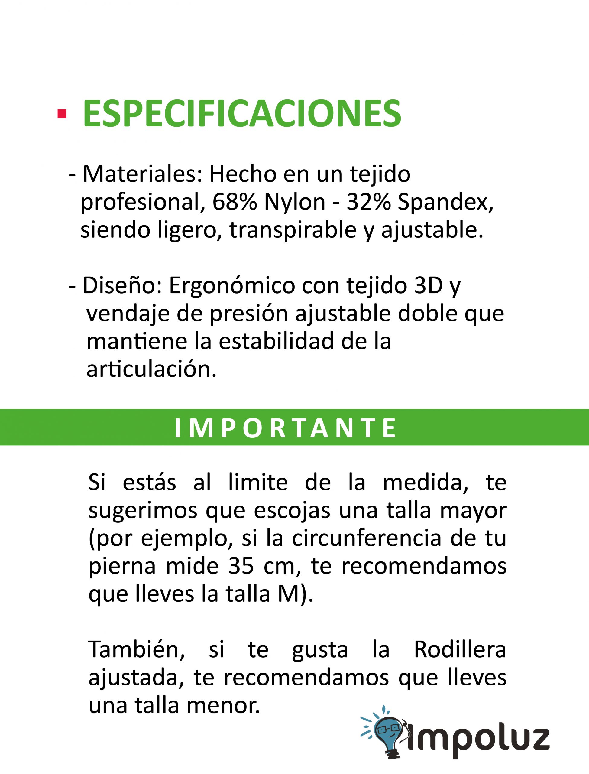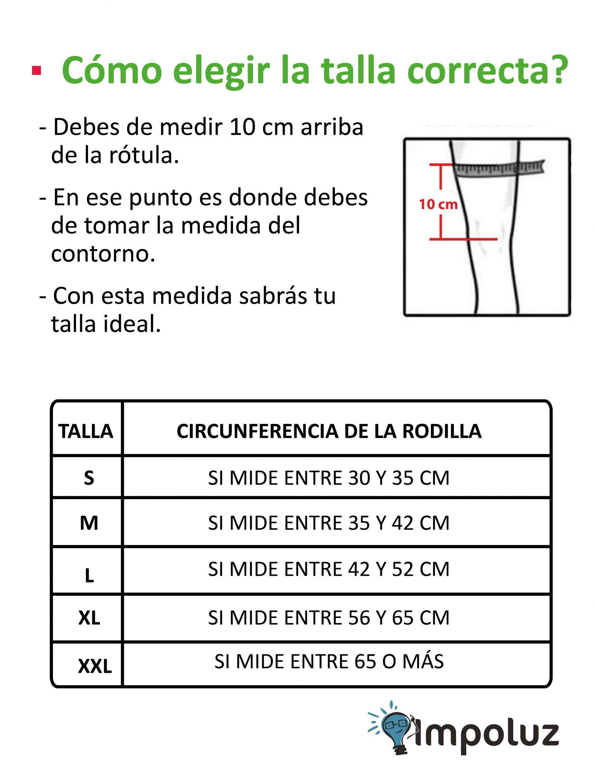 NOTA: Si estás al límite de la medida, te sugerimos que escojas una talla mayor (por ejemplo, si la circunferencia de tu pierna mide 35 cm, te recomendamos que lleves la talla M). También, si te gusta la rodillera ajustada, te recomendamos que lleves una talla menor.