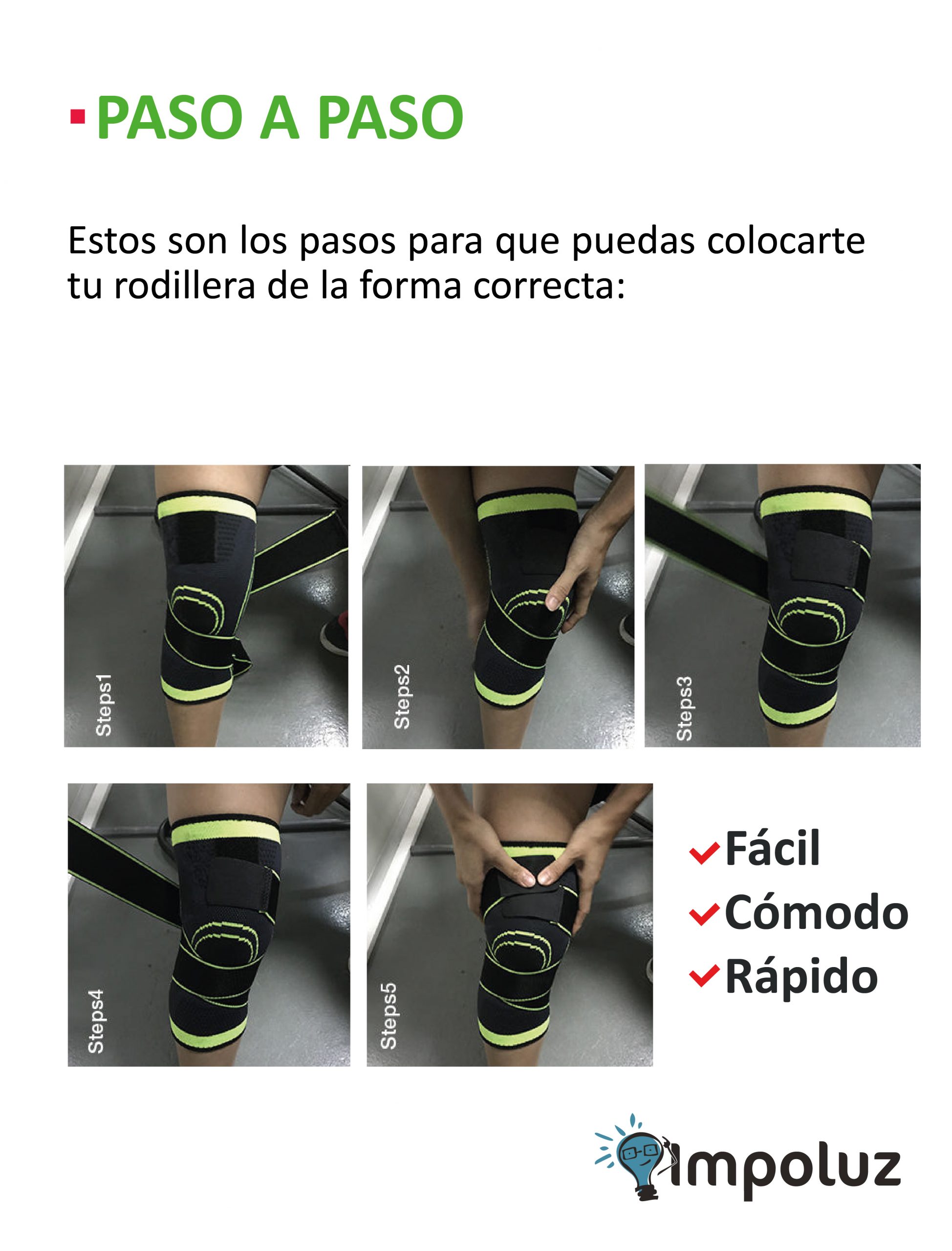 • Si la circunferencia de tu pierna mide entre 42 y 52 cm, tu rodillera es L. (Solo viene en color verde)