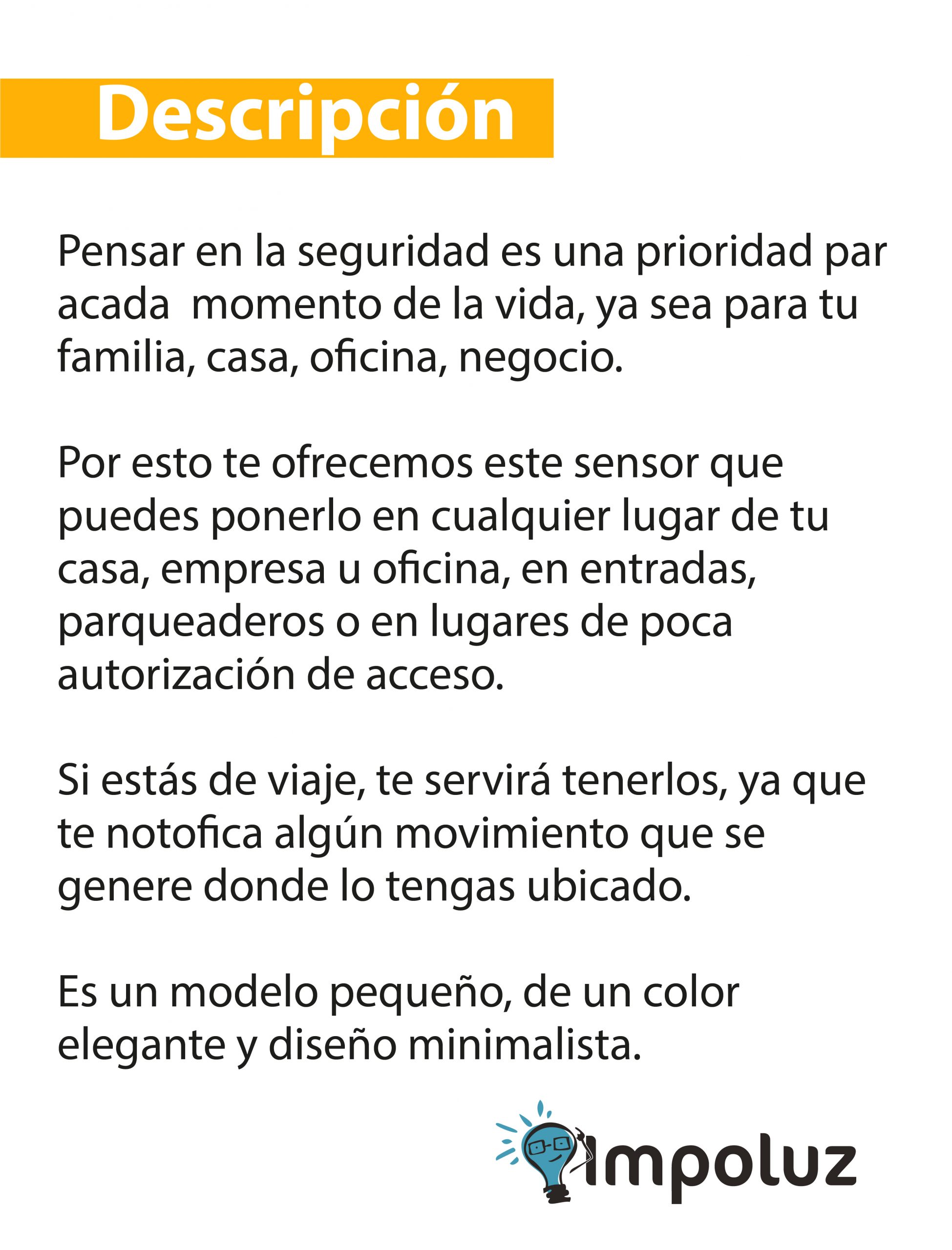Nuestros sensores de movimiento son la solución perfecta para una seguridad avanzada y sin complicaciones. Diseñado para ofrecer una detección precisa y confiable, este dispositivo es ideal para proteger tu hogar, negocio u oficina. Puede integrarse fácilmente en sistemas de alarma existentes, proporcionando una protección adicional y asegurando tu tranquilidad en todo momento. Además, su larga duración de batería y su versatilidad de instalación lo convierten en una opción conveniente y efectiva para cualquier entorno.